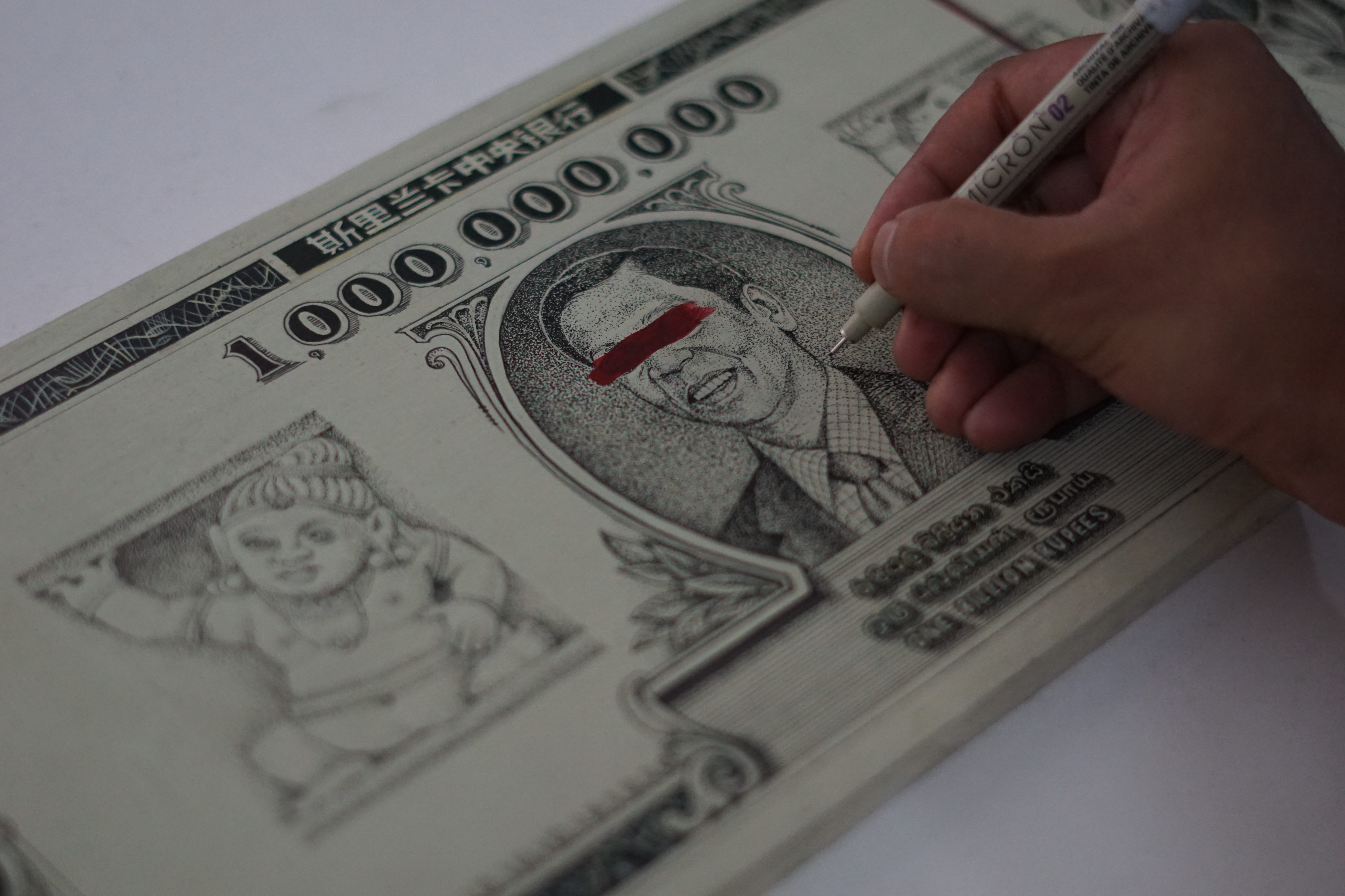 Malinda Jayasinghe (b. 1992) is a self-taught visual artist from Gampaha. He began his art career after completing an Art History course at Theertha International Artists Collective in 2019. His current practice combines drawing, painting and sculpting to explore religious, racial and gender privilege in institutions of power. In 2023, Jayasinghe completed a residency at Colomboscope and held his debut solo exhibition at the Harold Peiris Gallery. Since then he has exhibited in group shows in Colombo and Delhi. His latest solo exhibition, ‘Men in Robes’ was held at Paradise Road Gallery in August 2025.