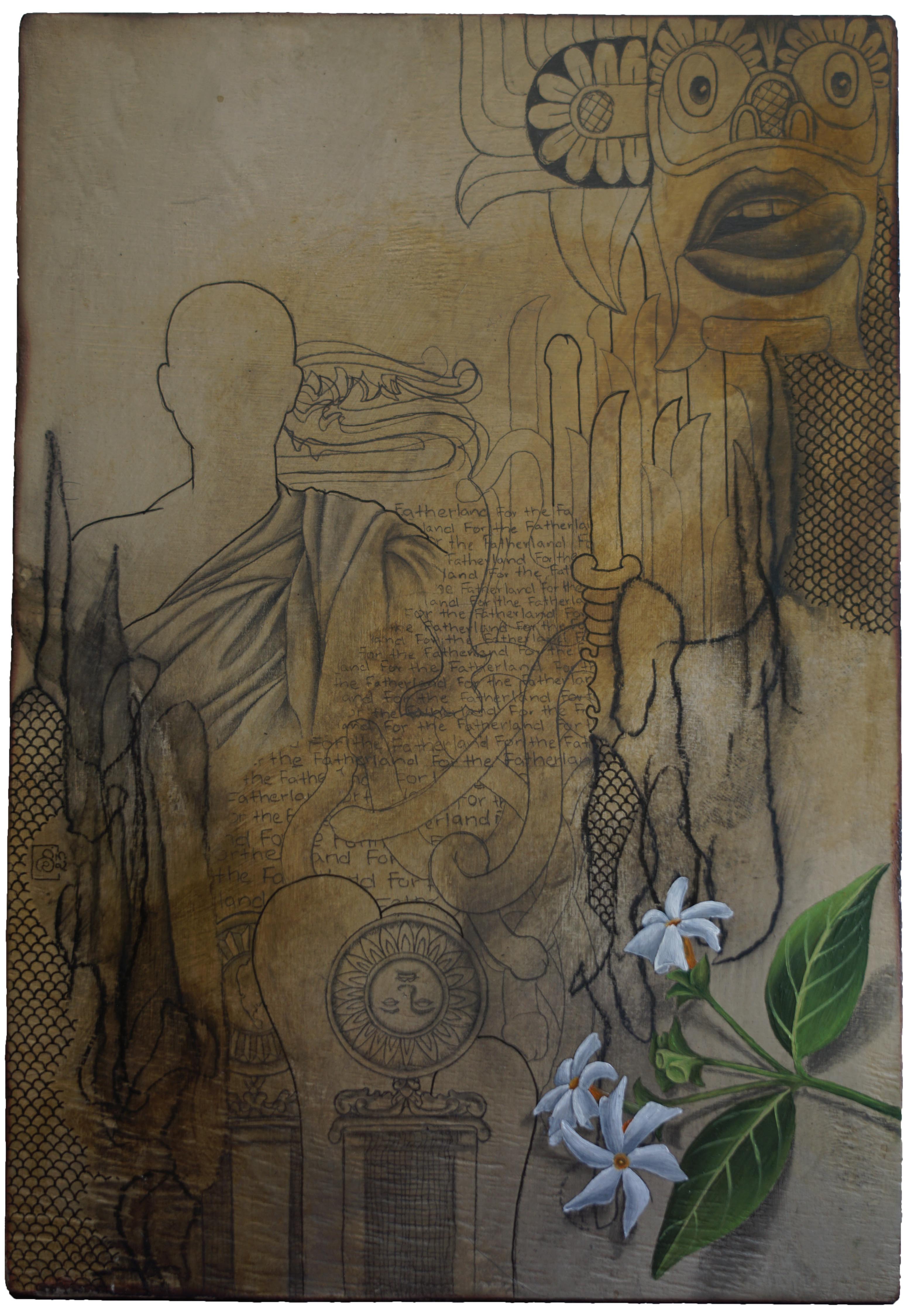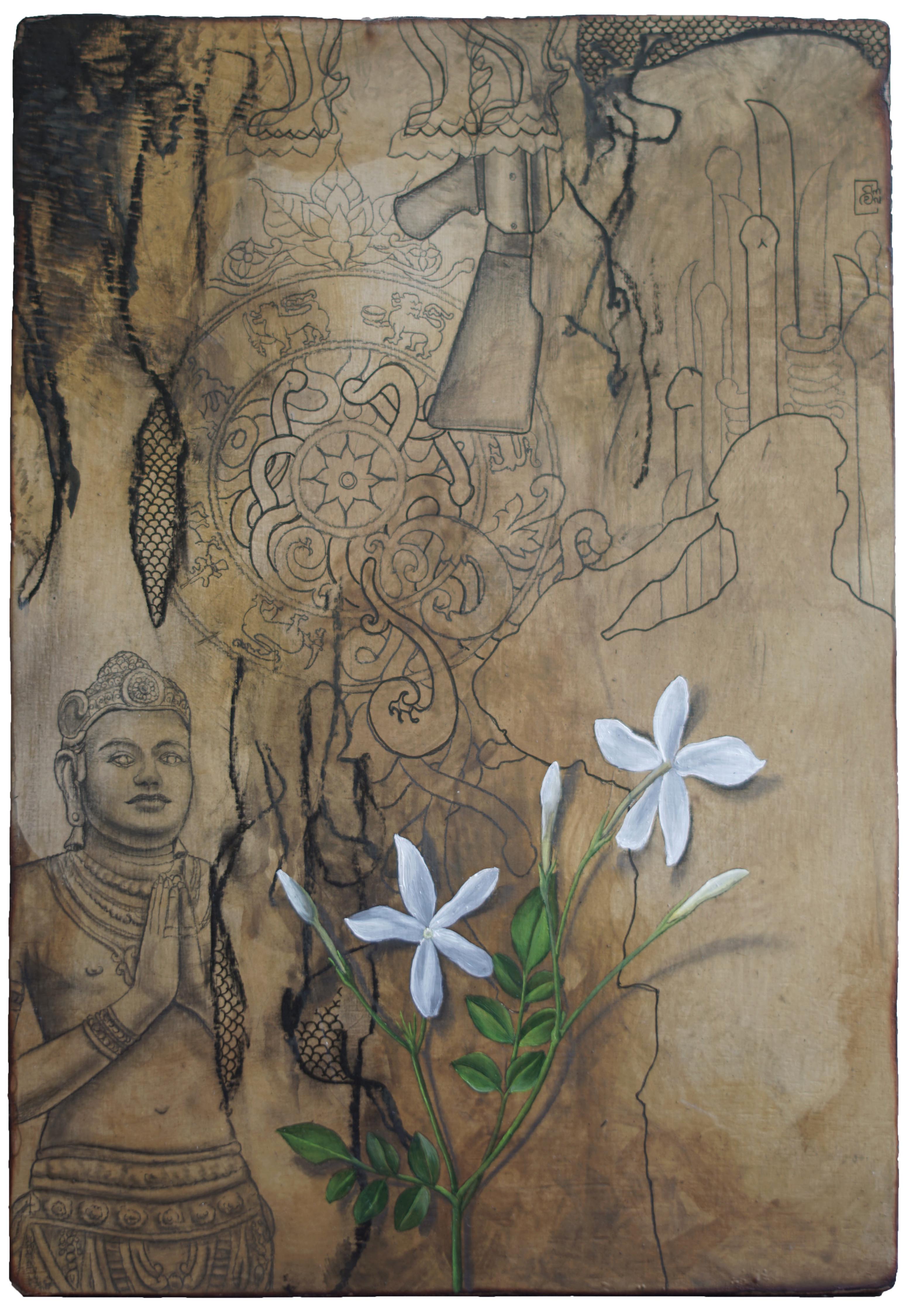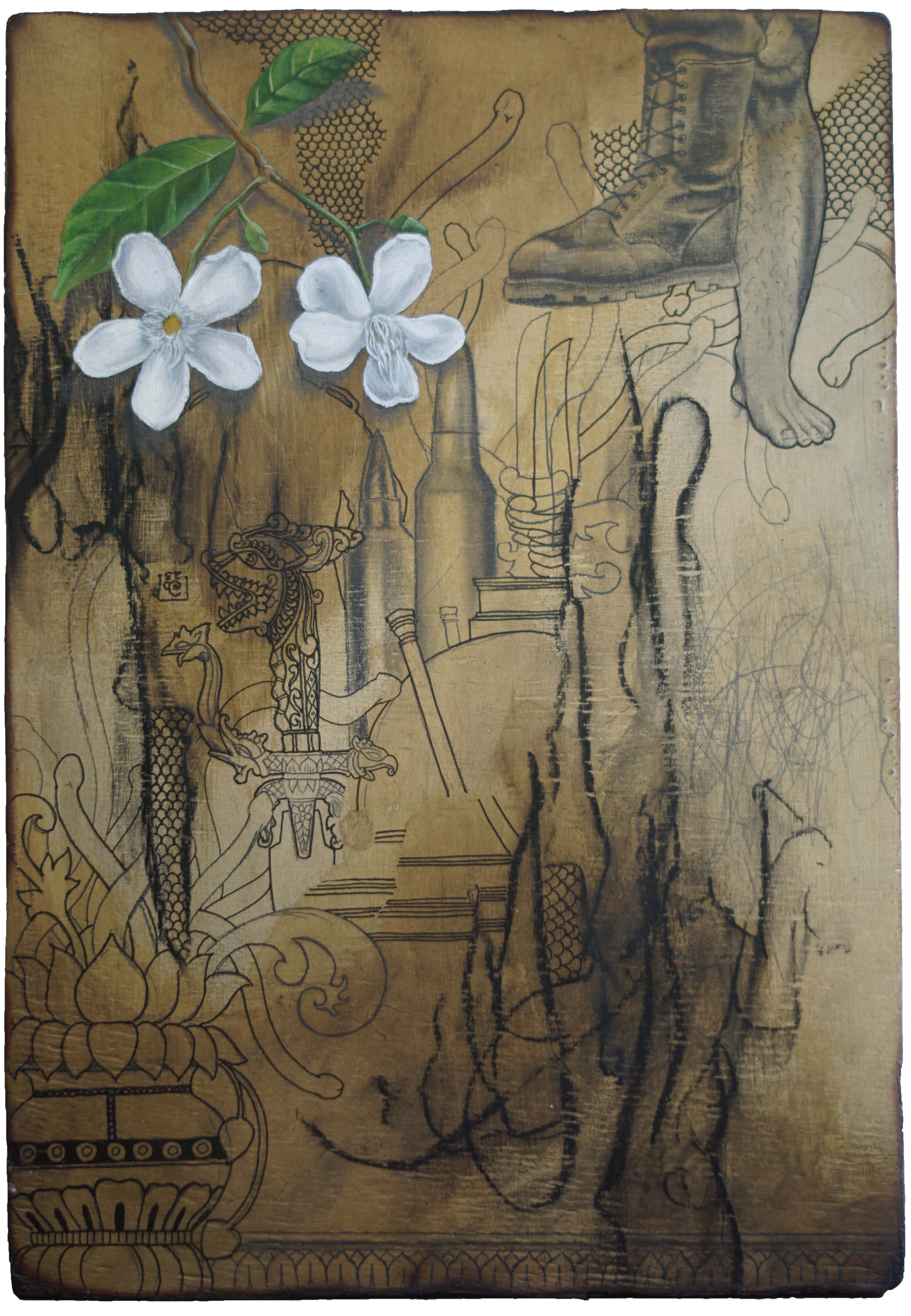 This series of wood panels employs mixed media to critique religion, militarization, patriarchy and nationalism. White flowers, popularly offered by devotees at Buddhist temples, foreground a chaotic and dystopian reality.