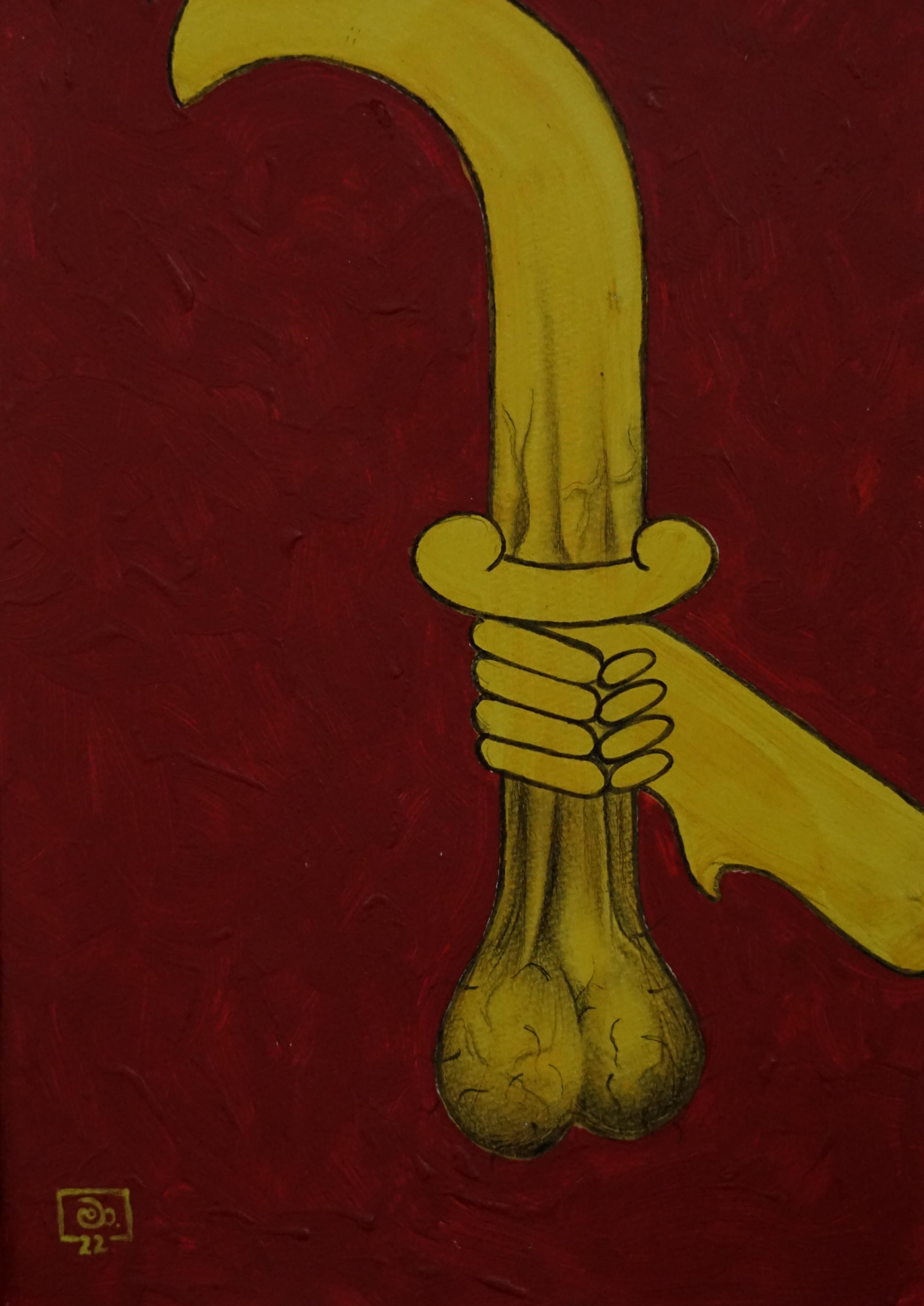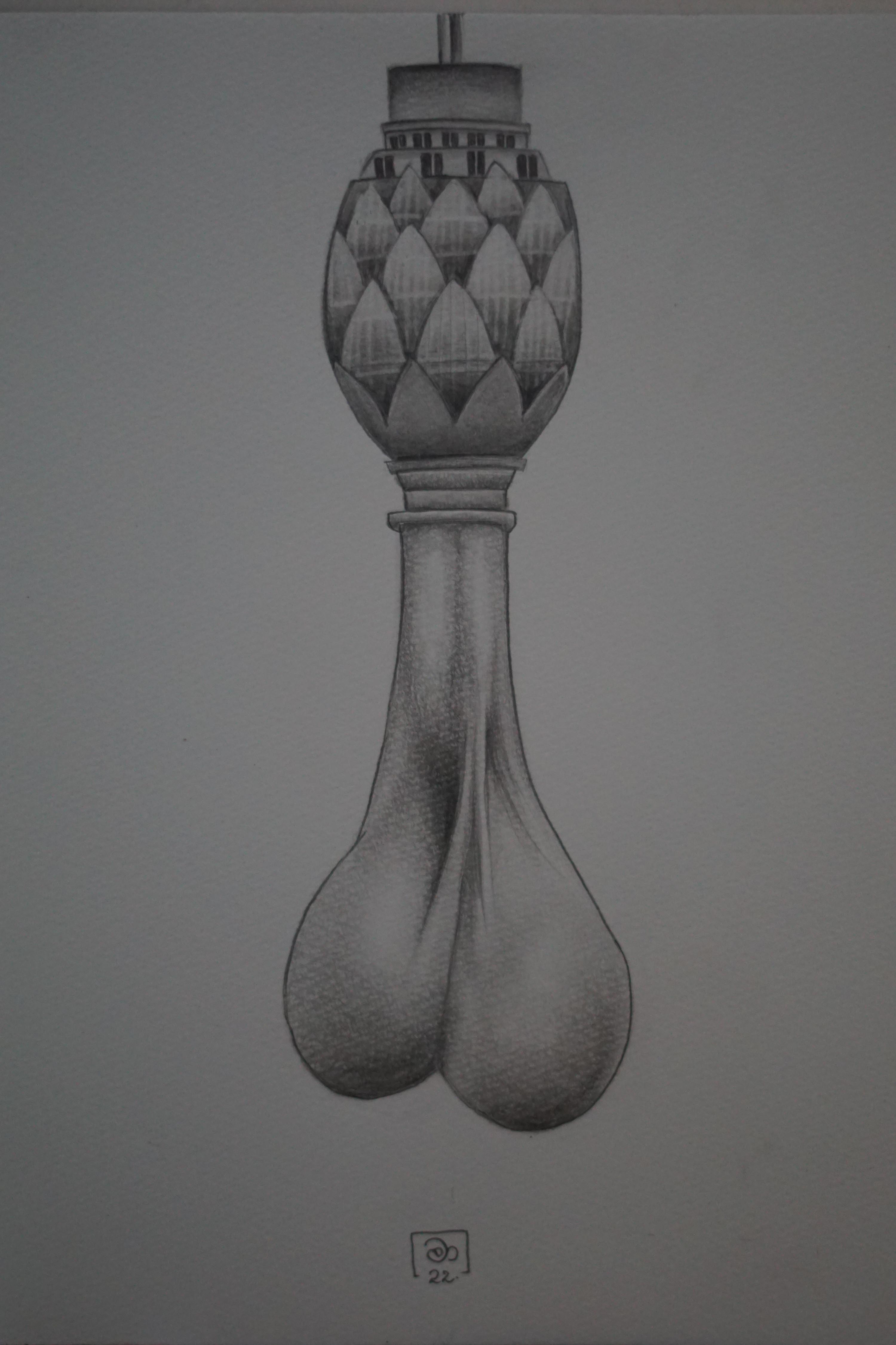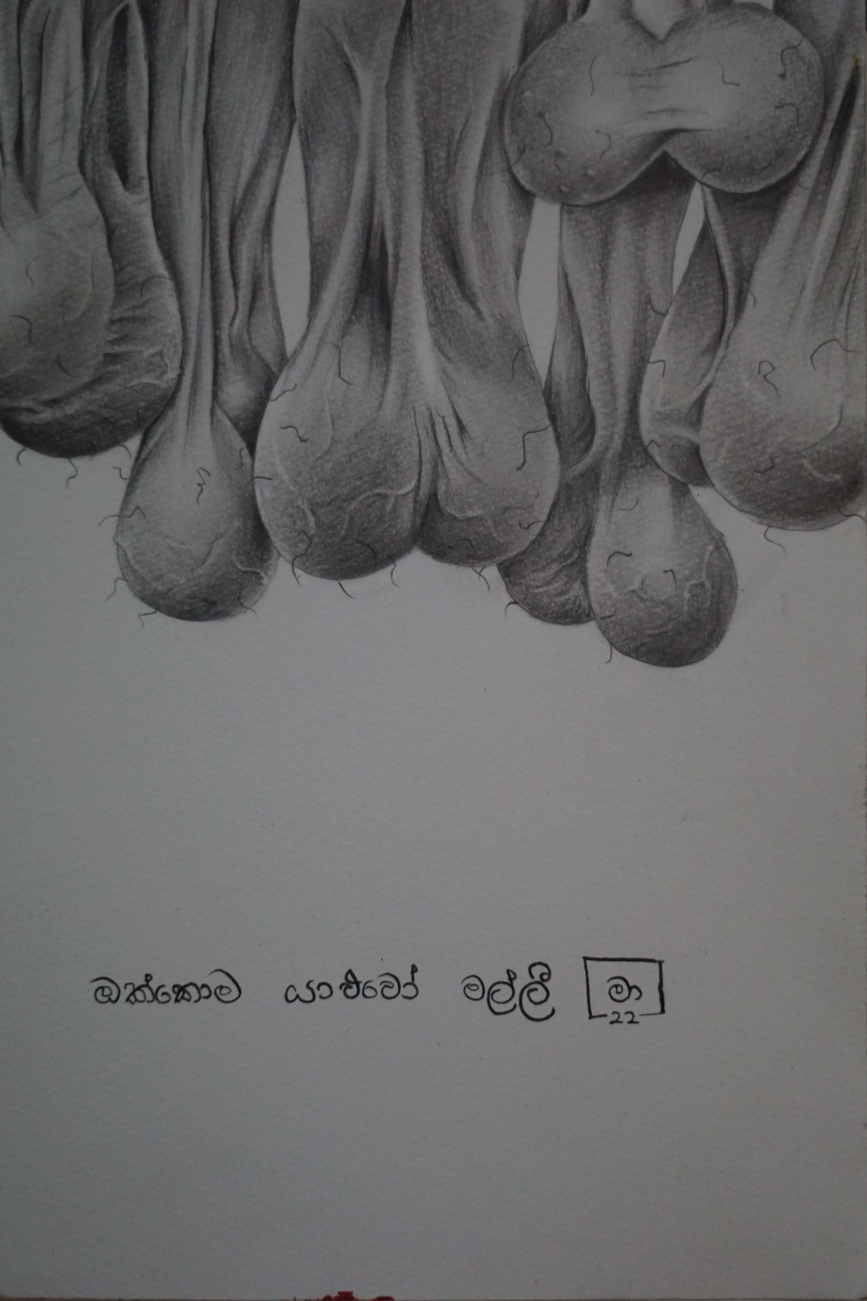 This satirical series critiques patriarchy and ethnonationalism by fusing drawings of testicles with symbols of Sinhala Buddhist power such as the Satakaya (shawl), the Lotus Tower, the Kastane (a ceremonial Sri Lanka sword) and military decoration. The title ‘Ellena Siyalla Rambutan Nove’ is a play on the aphorism ‘Not all that Glitters is Gold’.